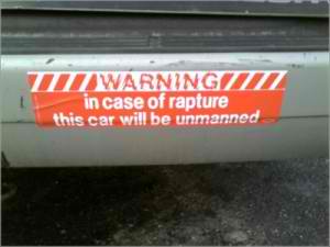 I must love my dogs because I kept thinking about what would happen in case of rapture. My car would still be cruising at 77 and I know my dogs are smart, but there’s no possible way they’d wake up in time to gain control of the car and bring it to a safe and harmless stop! So maybe I’ll come up with a new bumper sticker that says, “In case of rapture, hit this button.” Oh yeah, I’d put the bumper sticker inside so the dogs could see it, and oh yeah, I’d have a button installed that automatically pops out 3 red turtle shells to orbit around the car like on Mario Kart, and oh yeah, I would’ve already taught my dogs to press buttons, you know, with any available paw. No one knows when the rapture will happen, so I guess for now, me and my dogs will just cruise.