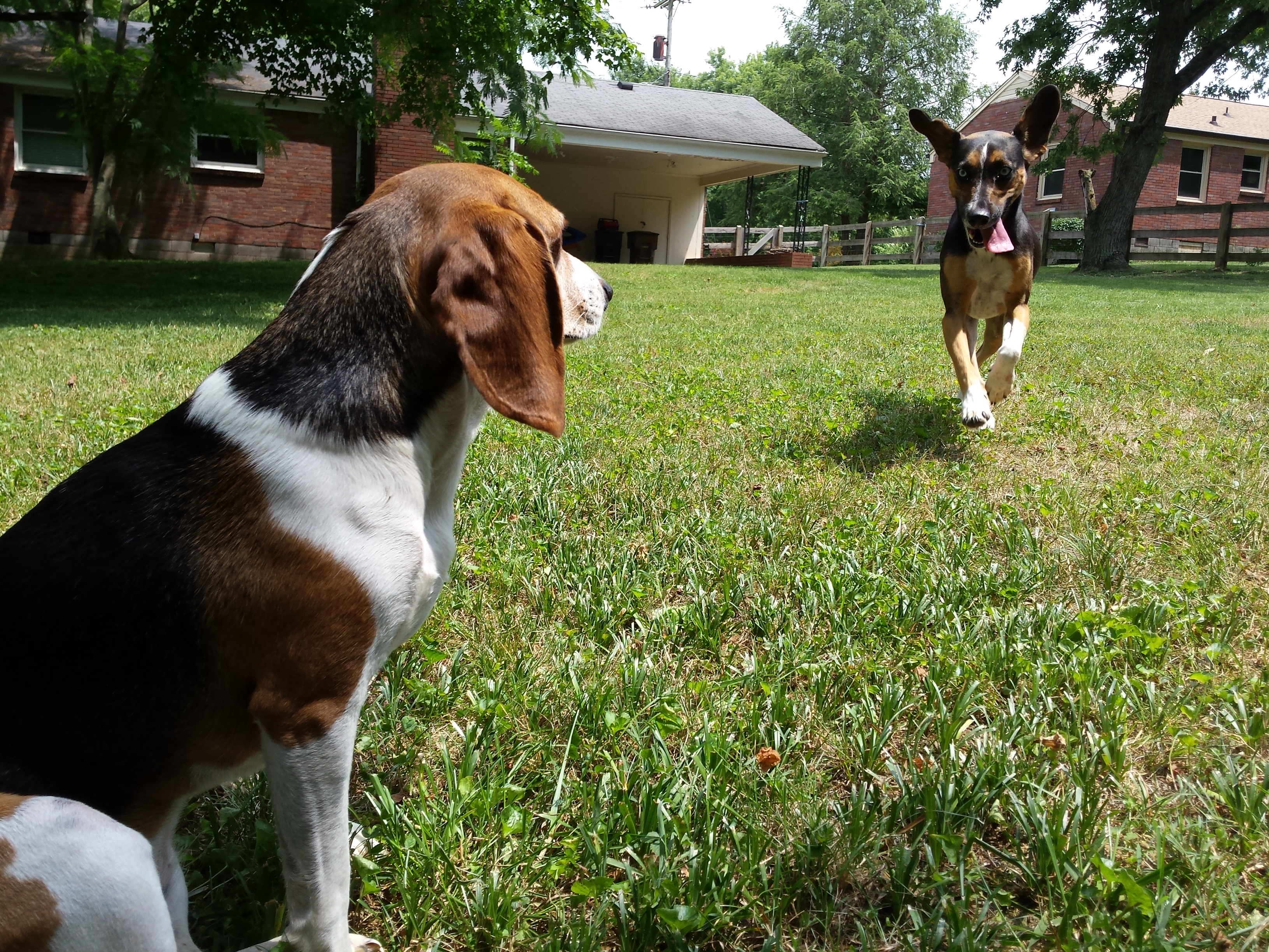 Perhaps they heard the legend of the rabbit babies that had to escape their rabbit home before they became Piper’s afternoon snack? That’s not folklore, folks. The dogs’ owner found one remaining baby bunny huddled against the brick of the house. Typically what happens inside the gates stays inside the gates, but you know the neighborhood… talk is cheap when the story is good. So these little animals take it on the run when these four-legged freaks are out. “Get to the speedwagon! The ladies are runnin’ wild!” is what they probably say. But it’s actually just Asia chasing that frisbee mentioned earlier, and Piper trotting to the fence for a pat on the head from neighbor Joyce.