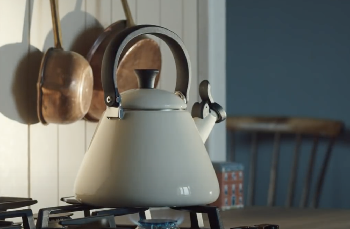 I remember thinking how irresponsible it would be for the man to leave the house with the stove top fire on under the teapot with no one home. Then I noticed the woman in the commercial. Was she added in later?