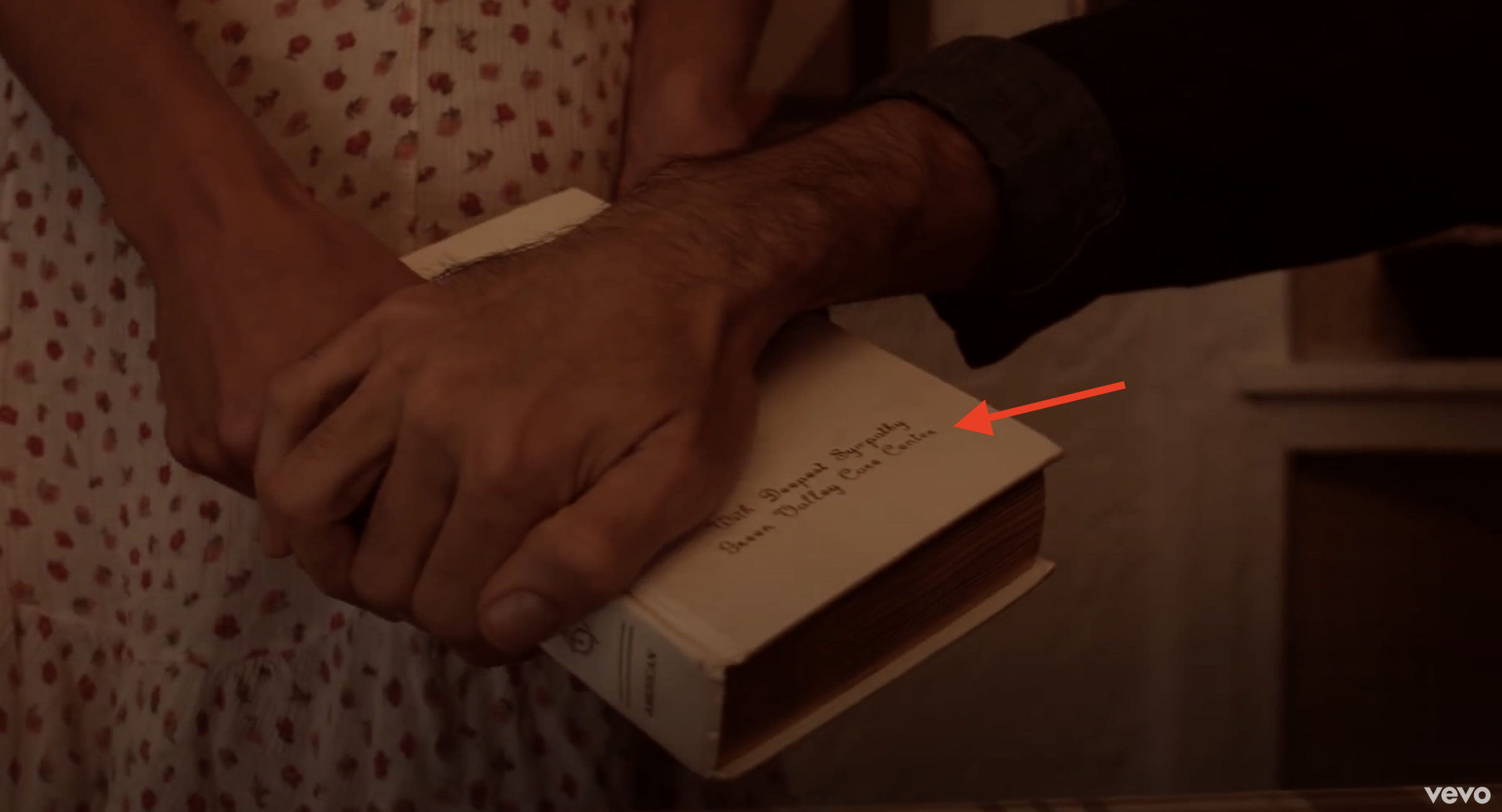 The Bible she picks up after her boyfriend spills beer on it says, “With Deepest Sympathy, Green Valley Care Center” …a nursing home facility in Indiana.