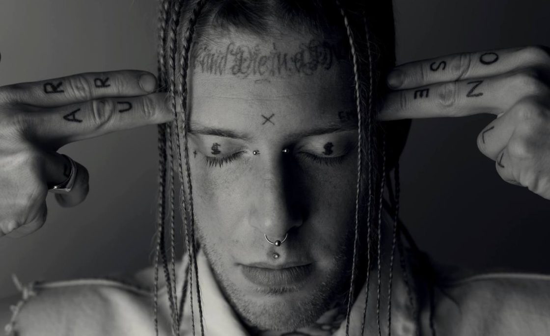 Forehead tattoo. “Live and Die in a Dream”.