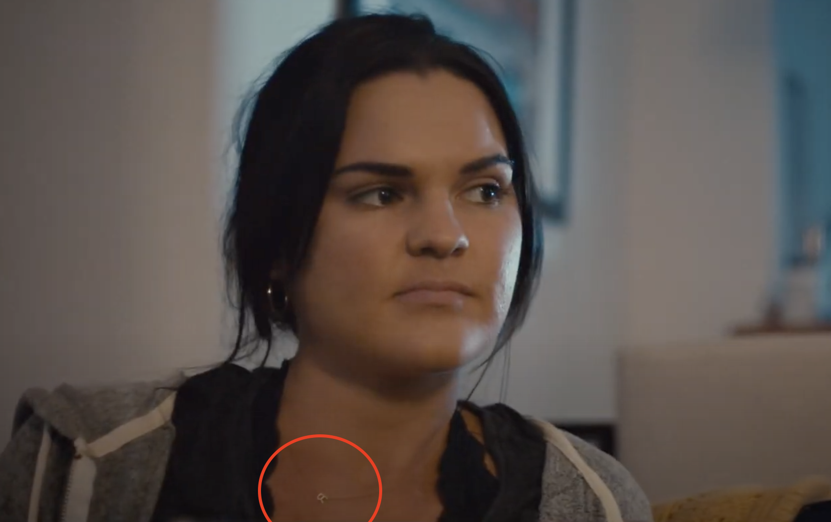 Reilly wears a thin necklace with a gold “R” around her neck as she watches the old videos.
