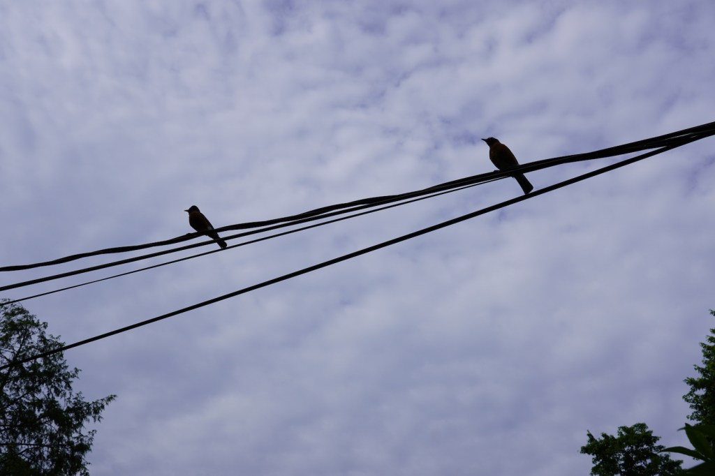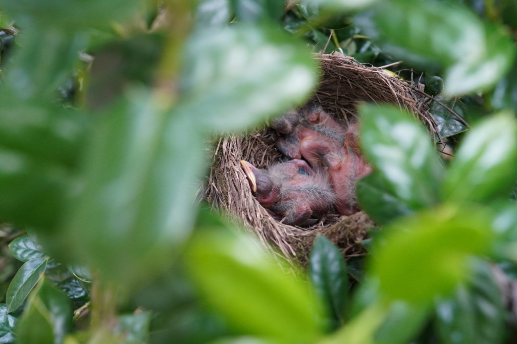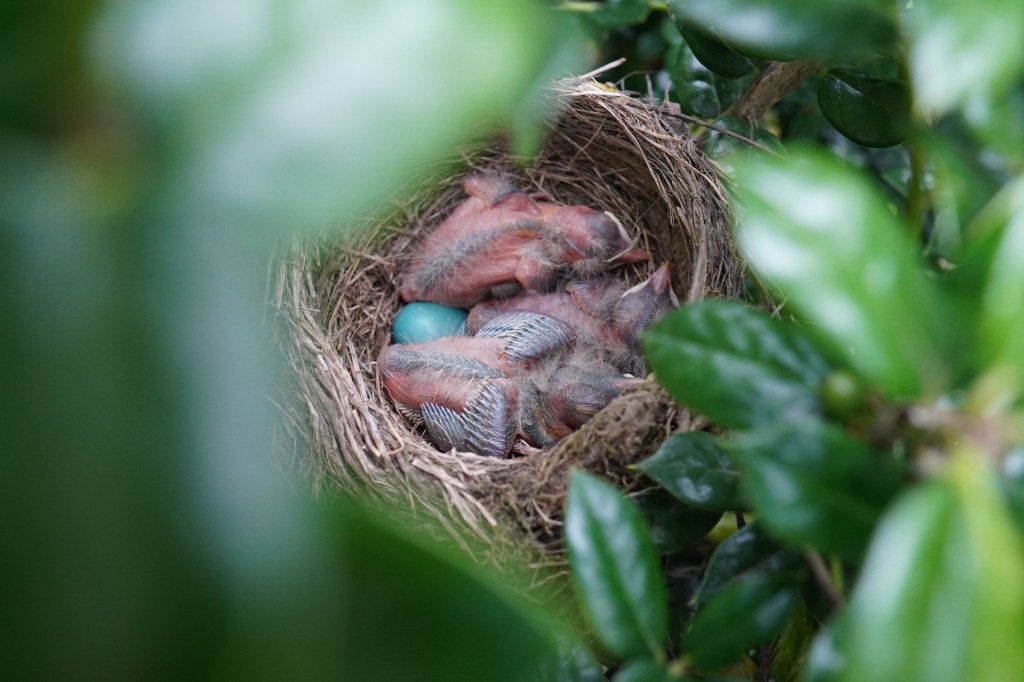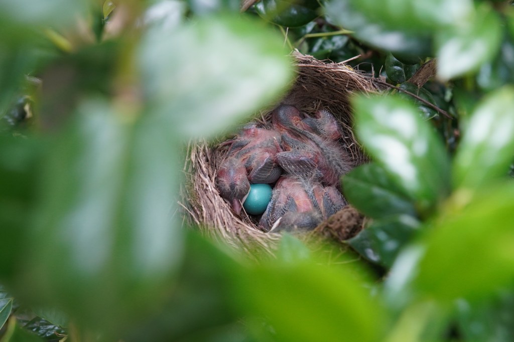 Back here in Tennessee, though, it’s only been a few days since these robins hatched and their skin is already darkening. It amazes me how quickly they are looking more and more like the birds they will become. So if you’ve been following along, you know there were four eggs in the nest in front of my house, three eggs which have hatched and a lone blue egg still resting in the nest. My guess is it won’t hatch, sadly, but what happens to it remains to be seen. Sad news aside, here are a few recent pics, including the first photos of mom and dad! They were hovering (like any good protective parent?) above me right before they dive bombed me for interrupting their lives… again.