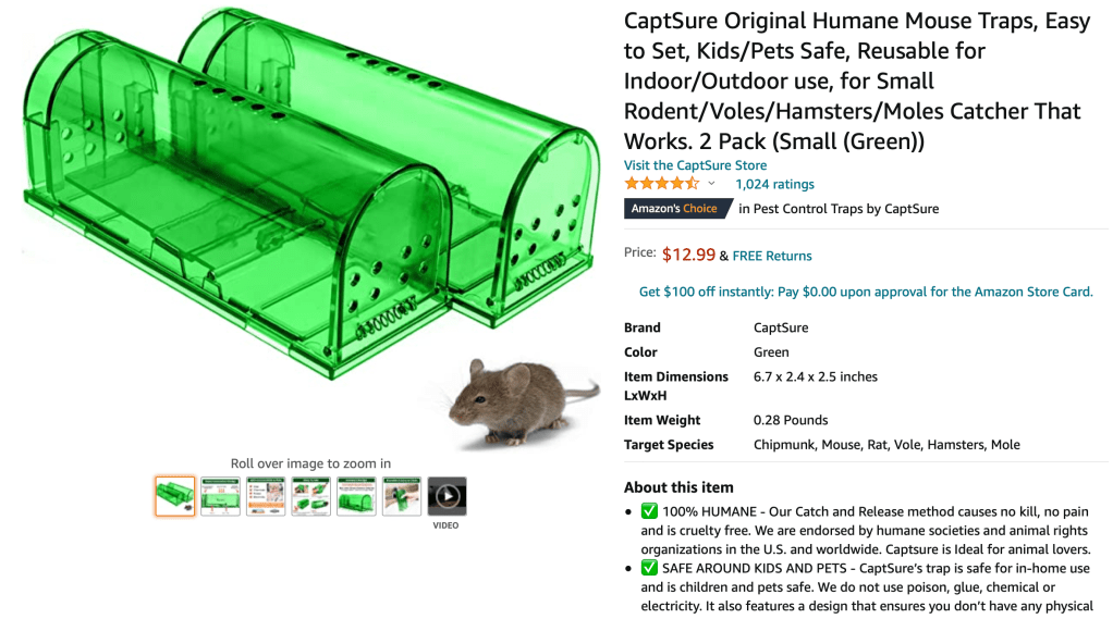 I’m determined to not kill mice in that way again. The very next day I found these traps on Amazon and they seem like a MUCH better way to resolve the problem, short of just somehow figuring out why they’re coming in and changing that factor.