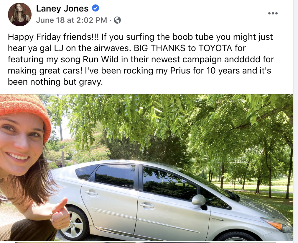 Be a fan. You can find Laney Jones on her social channels… Twitter and website and Facebook… and here is her reaction to being featured in the Toyota ad, as seen on her Facebook page…