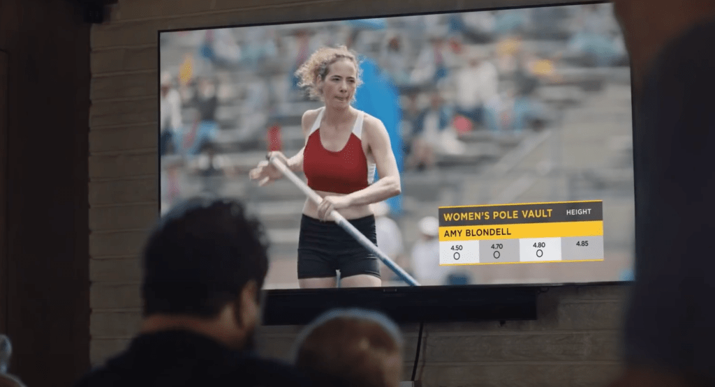 The sports. This minute-long ad features the following sports: pole vault, boxing, diving, gymnastics, wrestling, track/hurdles, soccer, and swimming.