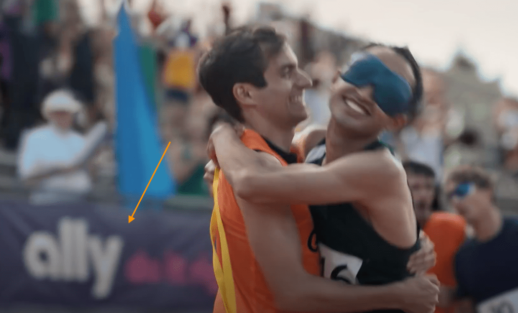 Olympics. I saw this ad during 2020 Olympics coverage, and so obviously I associate all the clips of sports in the commercial with the Olympics. However, in the ad there are no mentions of the Olympics, its logos, rings, or famous household names. In fact, all these sports most likely happened at the same sports complex. Yes, I dissected each clip for location markers. This could have all been shot at a large high school, but by using a great song and capturing heartwarming moments in sports, we think Olympics, we think winning, we think big. All while subtle hints of Ally sink into our subconscious.