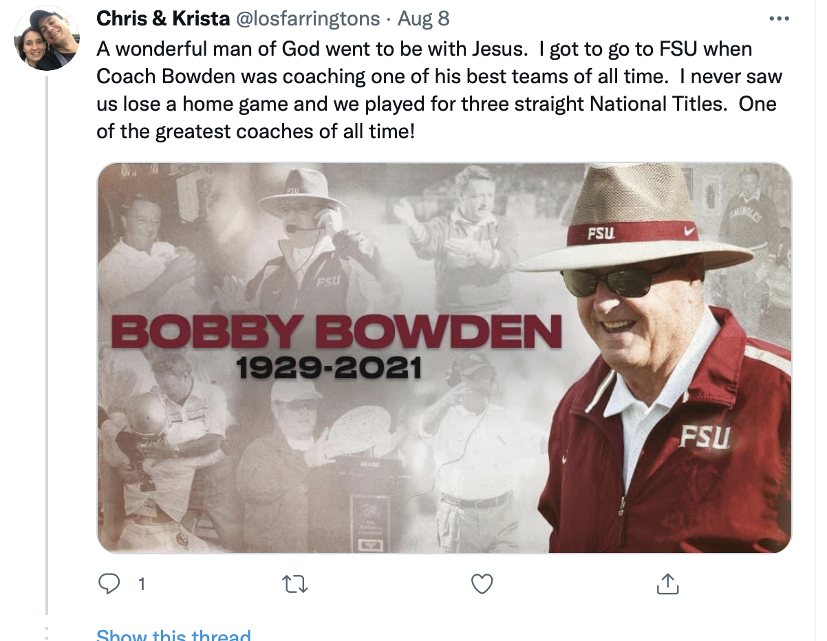As a man, he was full of charisma, humor, and kindness. As a Christian, he was honest, encouraging, and real. These qualities are why so many people loved him. It wasn’t about the wins, although those were nice. It was his personable nature that drew so many people to him. He may be a coaching icon because of what he did with FSU on the football field, but he’s a legend for how he made people feel.