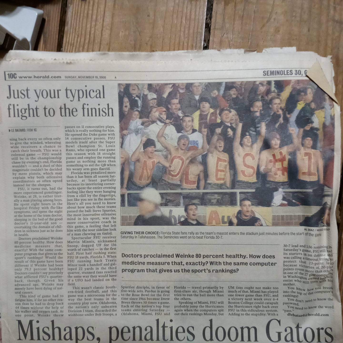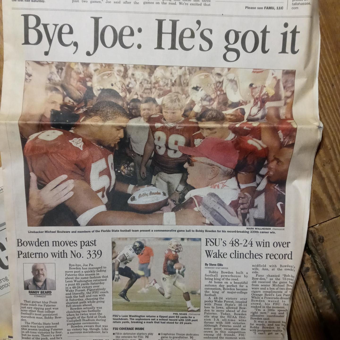I’ll conclude with a couple of photos from the local newspaper back in the late 90s/early 2000s. The first is when he became the winningest coach in college football history. The second is me and a few of my college friends when we painted our chests for a home game against our rivals, the gators.