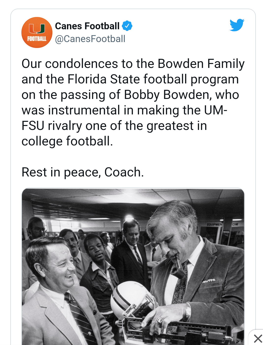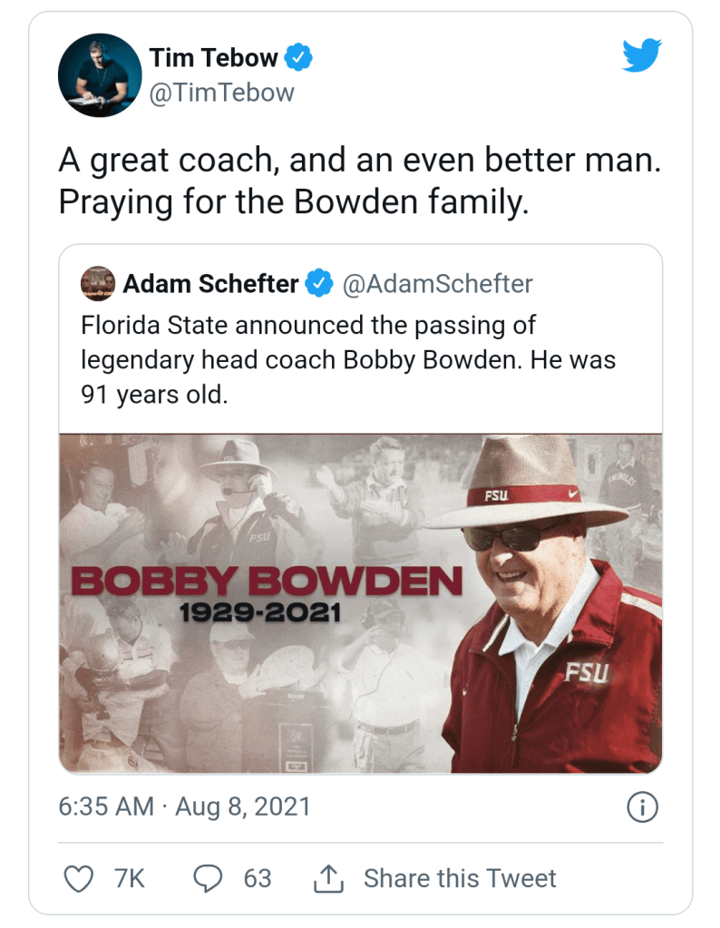 Since the memorial yesterday, I’ve felt a certain sadness that I didn’t feel earlier in the week. It’s like it finally registered in my brain that I’m living in a Bobby Bowden-less world. There was comfort knowing that, even though he wasn’t on the field coaching anymore, he was around. Going all the way back to the 80s when I was very young I learned from my parents to love FSU and FSU football. It was (at least in part) because of Bobby, although I didn’t know that at the time. I go back to the word “comfort.” It’s like a sense of safety, I think. Like a kid with a security blanket, or someone who holds a special trinket in their pocket that reassures them everything is going to be OK. Just knowing Bobby was around was a sort of security blanket that, even as crazy as the world gets, everything is going to be OK. Another thought I had during the memorial is this: how many coaches will have a celebration like this? His influence on and off the field reached past rivalry lines, through families, and all across the country. I can’t think of any other coach that will be celebrated as much as Bobby Bowden. There might be coaches with more championship wins, more regular season wins (not yet, though!), more players that go on to play in the NFL, but the fondness people feel for Coach Bowden, I just don’t think that has been or will be matched, maybe ever. I mean, even Tim Tebow who played for rival university of florida, tweeted this: