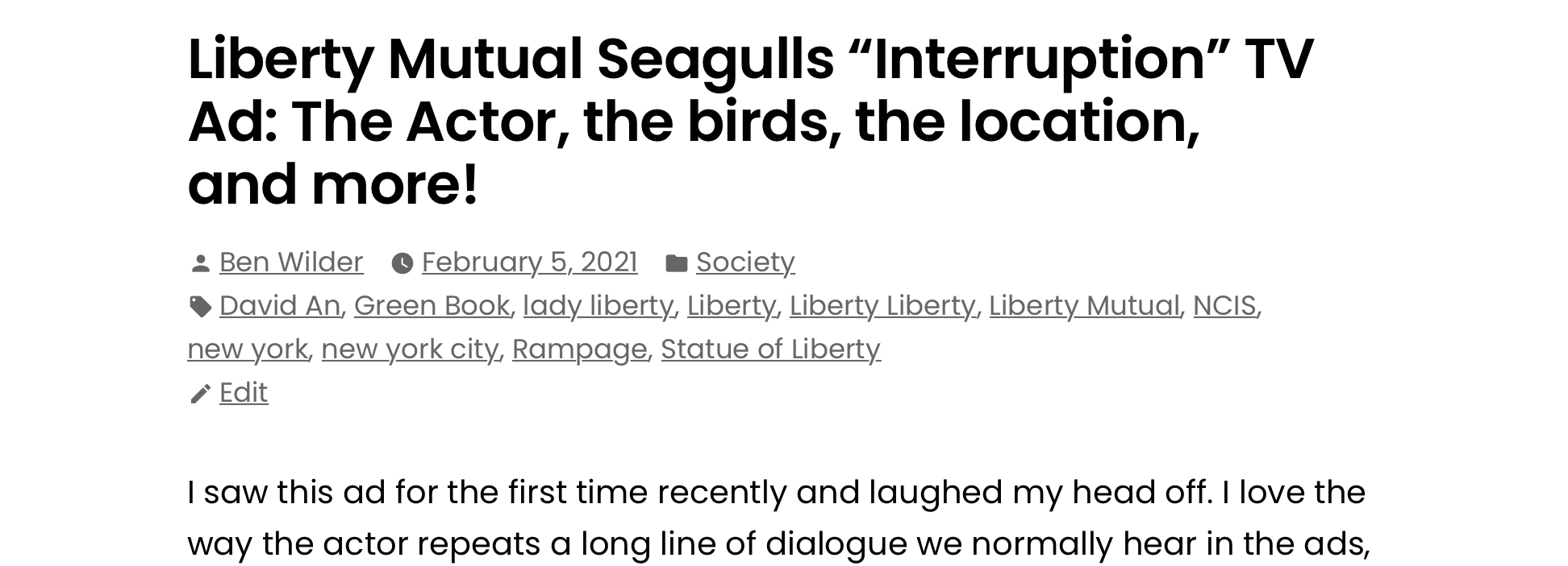 Liberty Mutual has been releasing ad and after in this seaside location with the statue of liberty as the backdrop. In fact, I’ve written about the “seagulls” ad here.