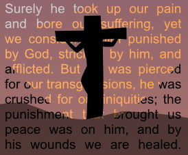 In the distance is the cross, the only thing on the entire landscape because if it’s true, what else could be added to make the message stronger, you know? The design of the sky background– the small repeating squares– consists of small text. Part of my favorite chapter in the Old Testament. Isaiah 53…