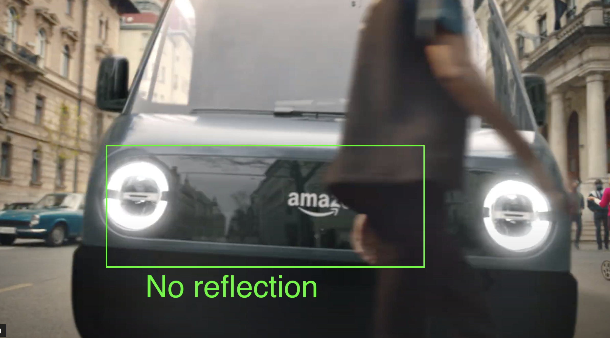2. I am always impressed when a particular camera shot SHOULD show a reflection of the camera equipment, but doesn’t. When we are taken around the front of Amazon’s electric van, there is no reflection of any equipment on the front of the van. Nice job!