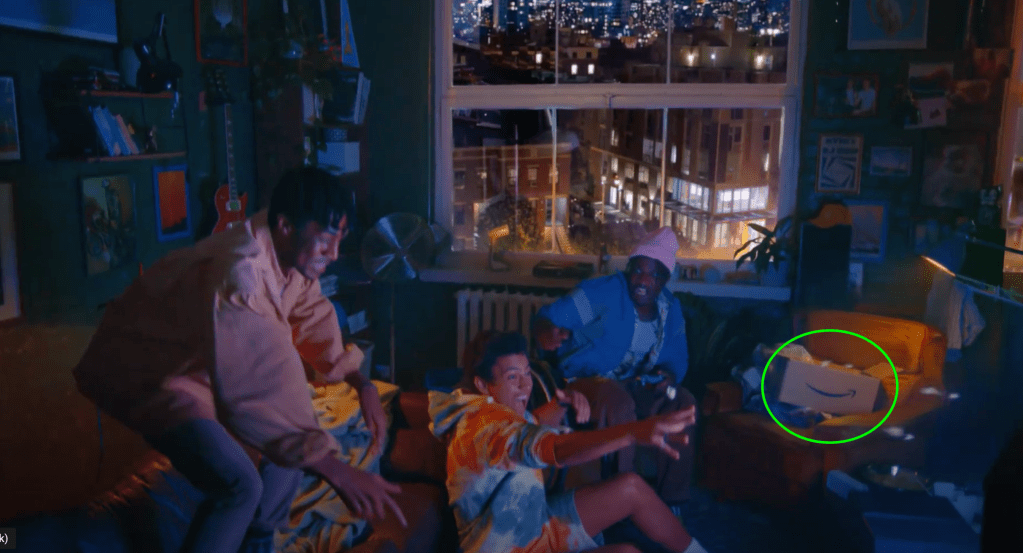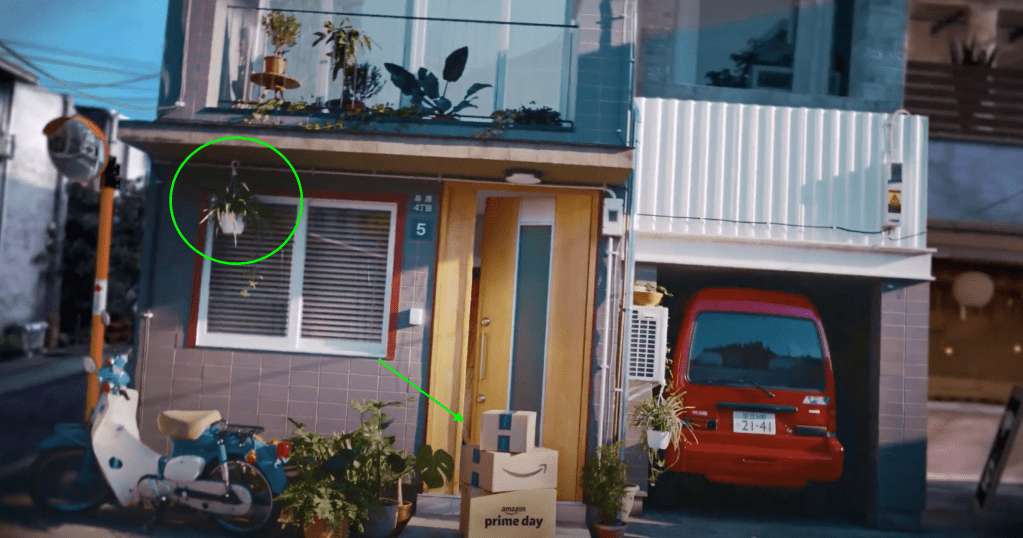 - The swinging plant. In the very first shot when a woman opens her front door, there is a hanging plant on her right. After a circle twist transition, packages are now at her front door and she’s excited. But that plant? It’s rocking back and forth. This attention to detail is nice, adding to the effect of that swirly circle transition. The also do this with the 3 stacked boxes, so watch it again with that in mind.